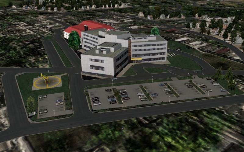 Das Krankenhaus verfügt über einen Helikopterlandeplatz an der Ostseite des Gebäudes.