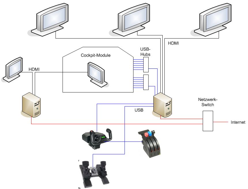 Der Erste steuert die drei Monitore für die Außenansicht. Auf diesem läuft auch X-Plane und ein paar Hilfsprogramme. An diesen Rechner sind das Steuerhorn, der Quadrant und die Pedale sowie meine Cockpit-Module über USB angeschlossen.