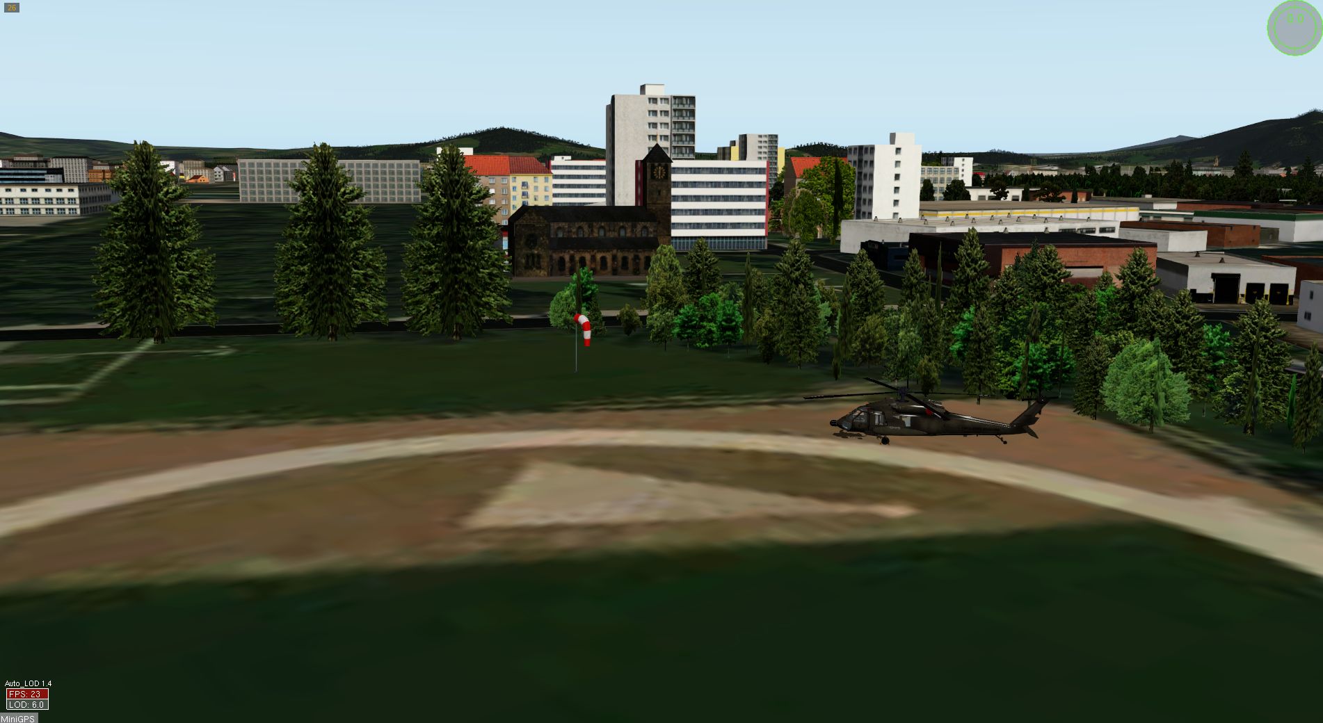 Sie besteht nur aus dem Helipad, einem Windsack und einigen Bäumen sowie den Exclusions um die Autogen-Objekte auf dem Platz zu entfernen.